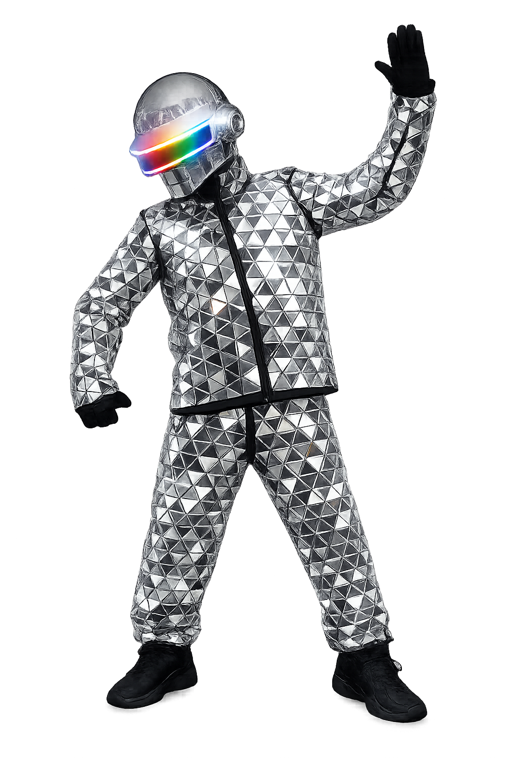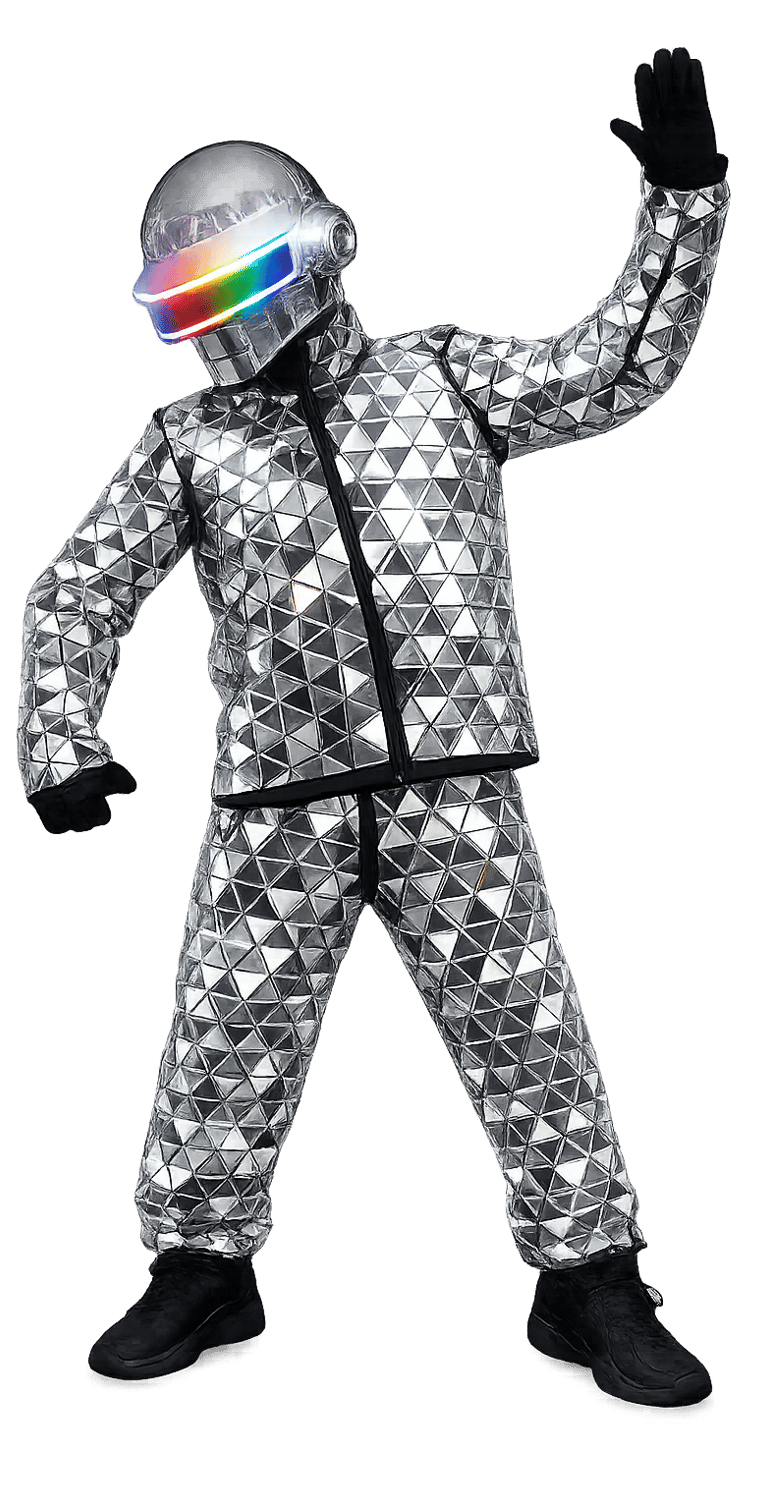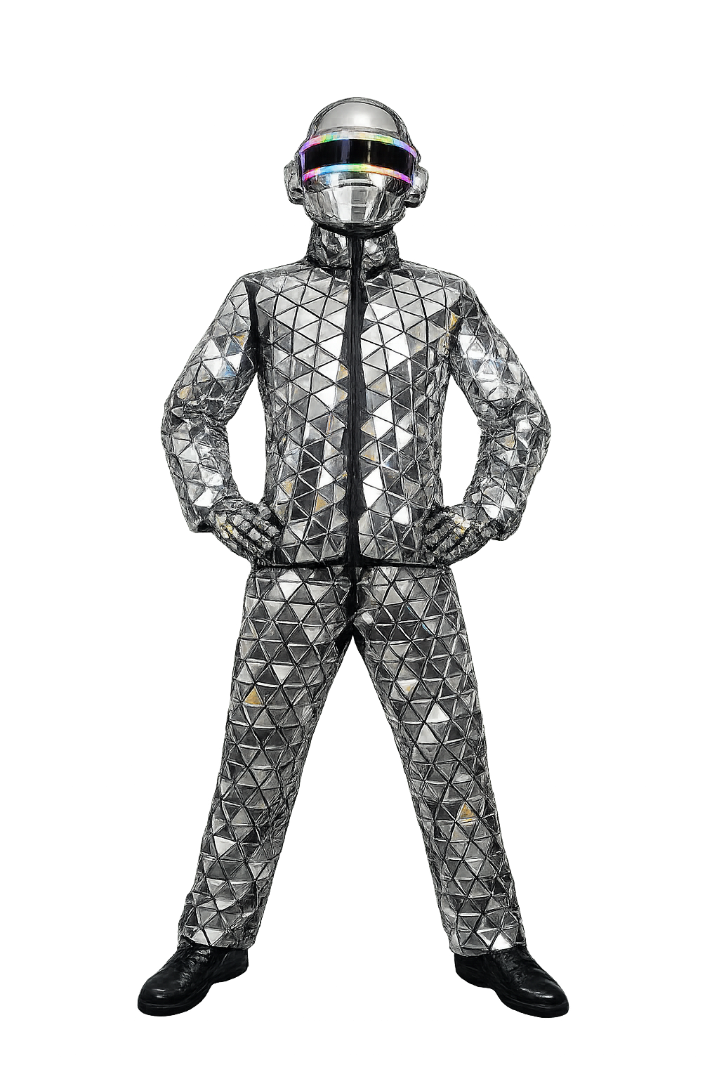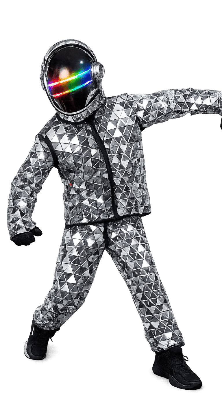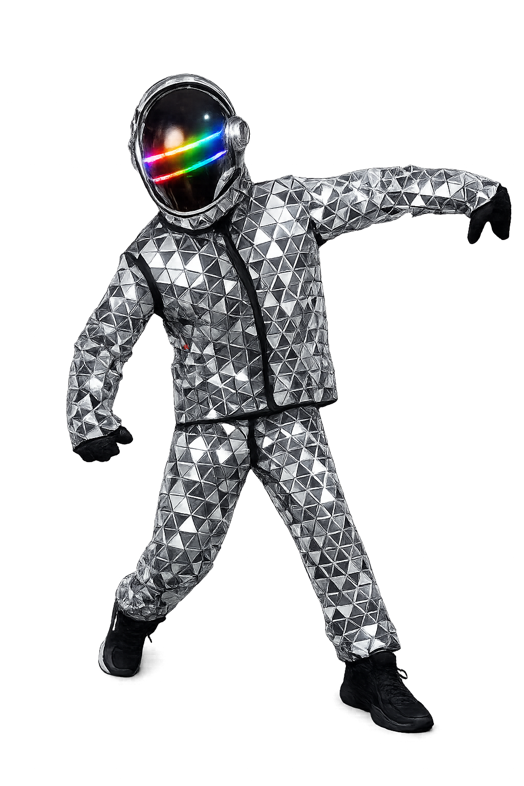 Un personaje futurista y deslumbrante que roba todas las miradas. Vestido con espejos plateados de alto brillo, es ideal para crear momentos únicos en entradas, shows o sesiones fotográficas. Elegancia moderna con un toque de espectáculo.