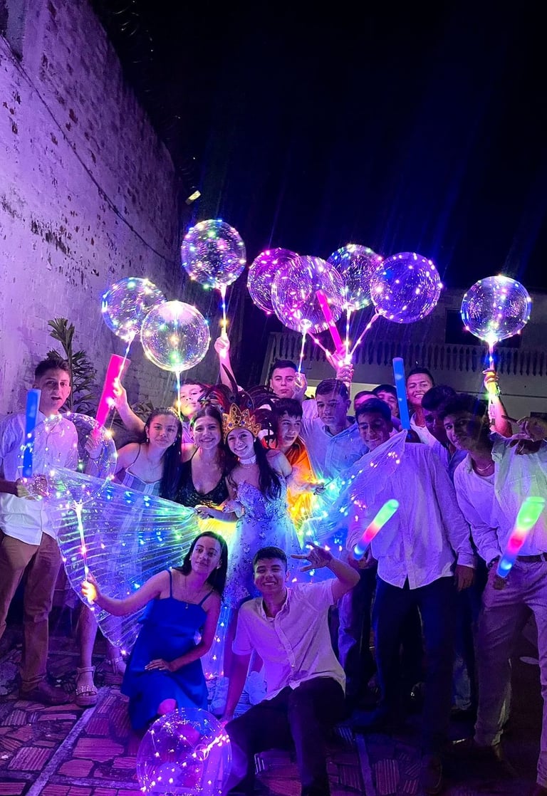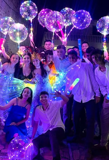 El toque final que convierte cada momento en una experiencia única. Contamos con una amplia variedad de accesorios temáticos y divertidos como gafas luminosas, sombreros extravagantes, collares, pulseras, espumas, y mucho más. Cada elemento está pensado para potenciar la interacción, el ambiente festivo y lograr que tus invitados se sientan parte del show. Perfectos para fotos inolvidables y una hora loca llena de color, brillo y estilo.