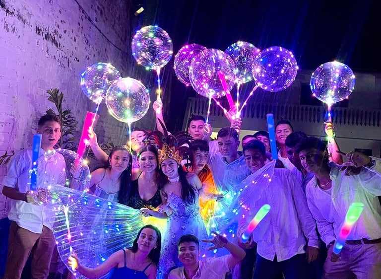 Complementos únicos que elevan la experiencia de tu hora loca. Desde gafas, sombreros y collares, hasta elementos temáticos con brillo y estilo. El detalle perfecto para que tus invitados se diviertan y se lleven el mejor recuerdo.